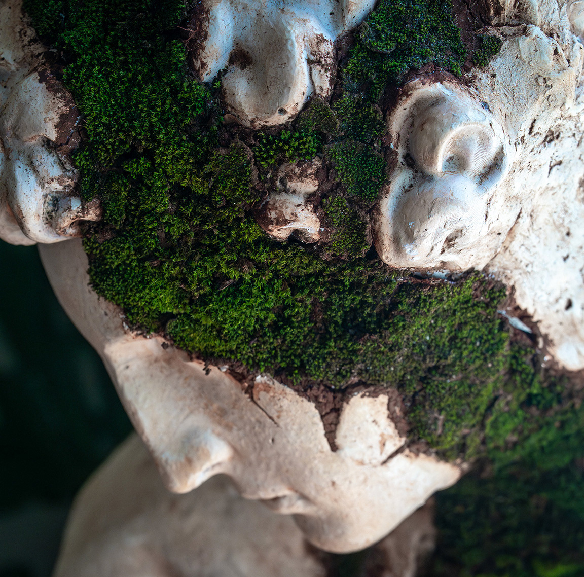 Living forest moss, organic earth, sculptural mineral plaster, and fine resin